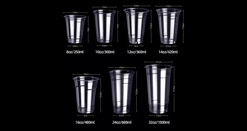 با توجه به اینکه لیوانهای طلقی در اشکال و حجمهای متنوعی تولید میشوند، آن ها را با توجه به ابعاد و حجم آن ها نیز دسته بندی می کنند.